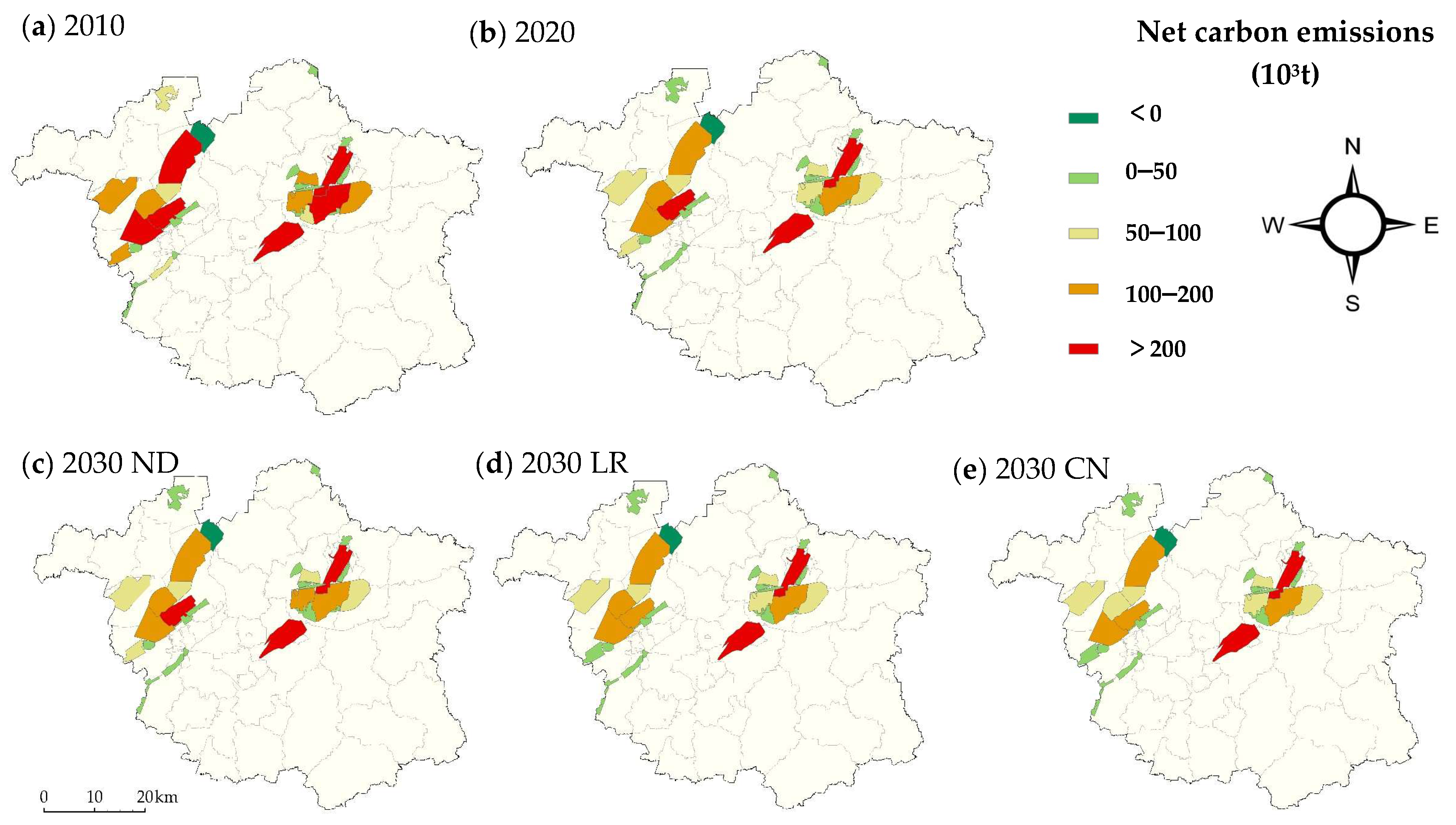 It is projected that by 2030, under all three scenarios, the spatial patterns of the net emissions will largely continue along the historical trend during 2010–2020: mining land emissions will continue to decrease, and the high-emission zones will continue to shrink. Under the ND scenario, the distribution will be similar to that in 2020. Under the LR and CN scenarios, the medium-low areas will expand, and the high-emission urban cores will shrink. Under the CN scenario, many medium zones will shift to medium-low zones, especially in the north, and low-emission areas around Liguo Town will increase.