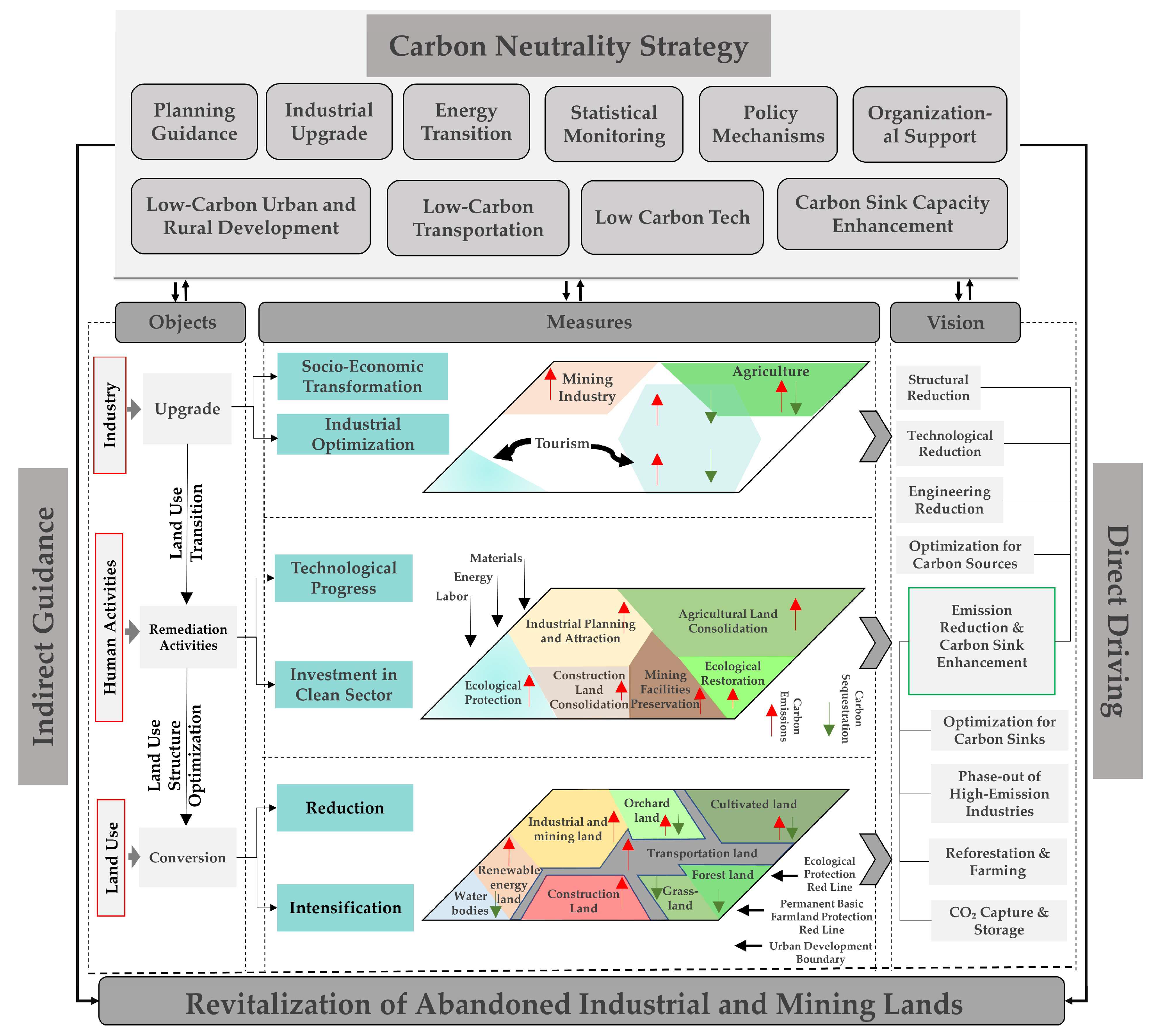 As a central agenda of global climate governance, carbon neutrality offers new opportunities for transforming resource-dependent cities. In this context, integrating carbon-neutral objectives into land use planning may provide a strategic pathway to overcome the limitations of conventional reclamation and support coordinated low-carbon and ecological development. Within mining cities, the pursuit of carbon neutrality therefore requires more than conventional ecological restoration; it necessitates a fundamental restructuring of land systems to reorient spatial patterns toward low-carbon development [