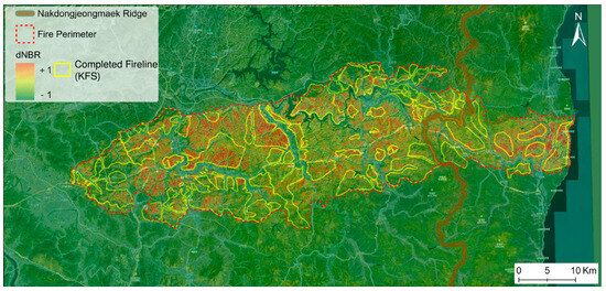 Map of the study area showing the burn severity (dNBR) of the 2025 Gyeongsangbuk-do forest fire, the derived fire perimeter, completed firelines (KFS), and the Nakdongjeongmaek Ridge.