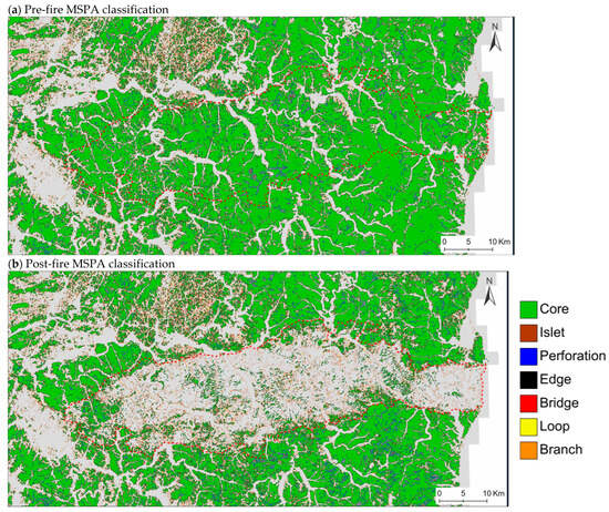 Spatial distribution of MSPA classes before and after forest fire in the study area. (a) Pre-fire MSPA classification showing continuous core habitats. (b) Post-fire landscape structure showing severe core fragmentation. Key transitions include: Core loss (red dashed boundary interior, −83.85%), Islet proliferation (+975.69%), and Edge expansion (+18.25%p). Quantitative changes for all classes are detailed in Table 2 and Table 3.