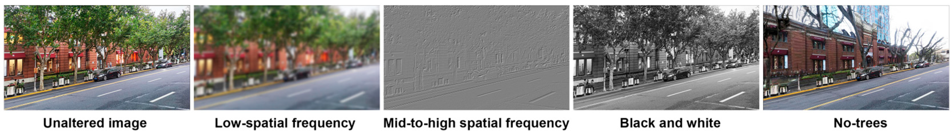 Figure 2). Participants viewed images from two categories—Huaihai Road or non-Huaihai Road—under four different manipulation conditions: original images, low-frequency images, mid-to-high-frequency images, black-and-white images, and no-trees images.