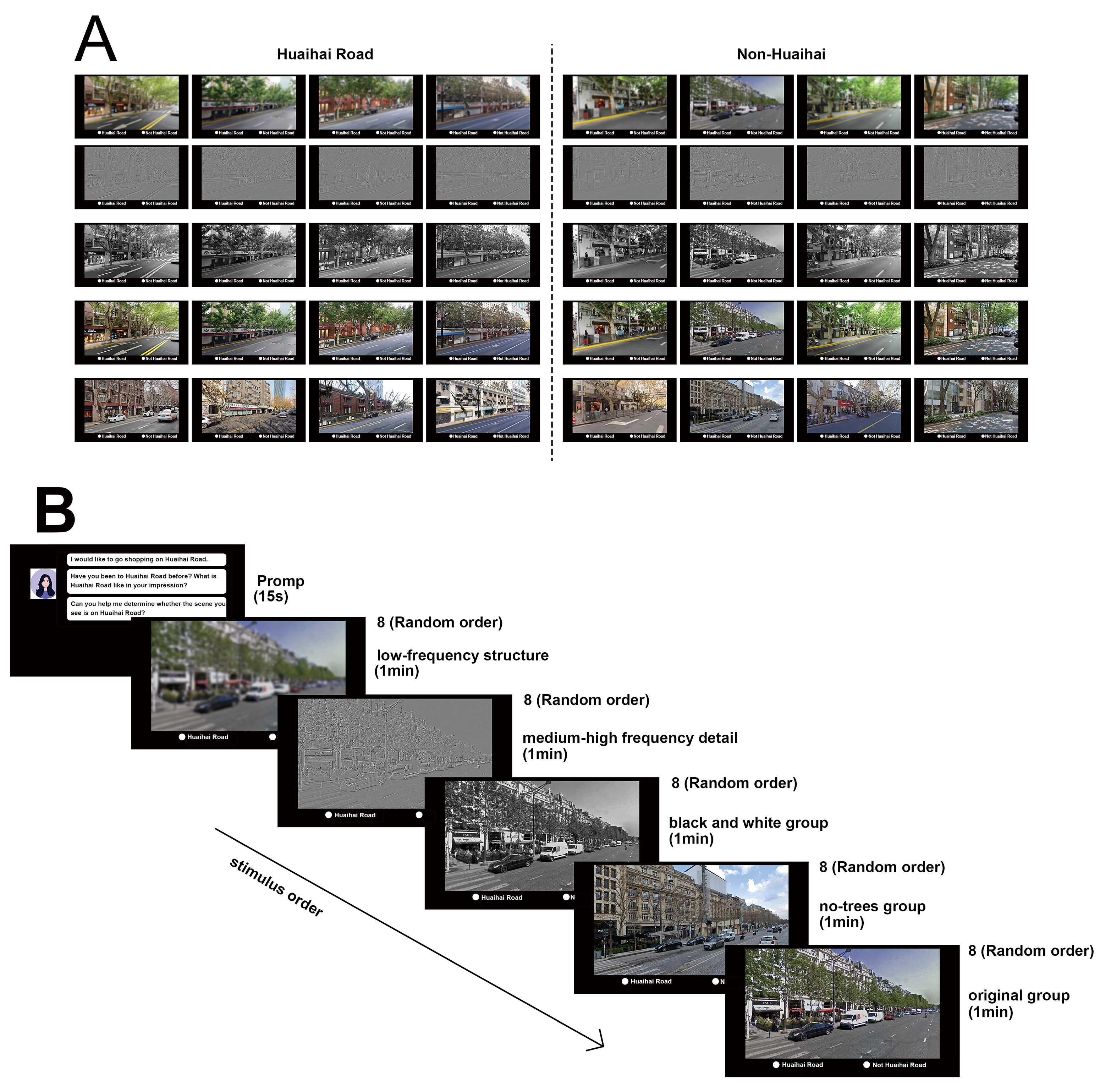 Participants were introduced to the study with a brief explanation of the task. They were instructed to determine whether the street shown in each image was Huaihai Road or another location. The experiment employed a 2 (Huaihai Road, other streets) × 5 (type of image) factorial design (see