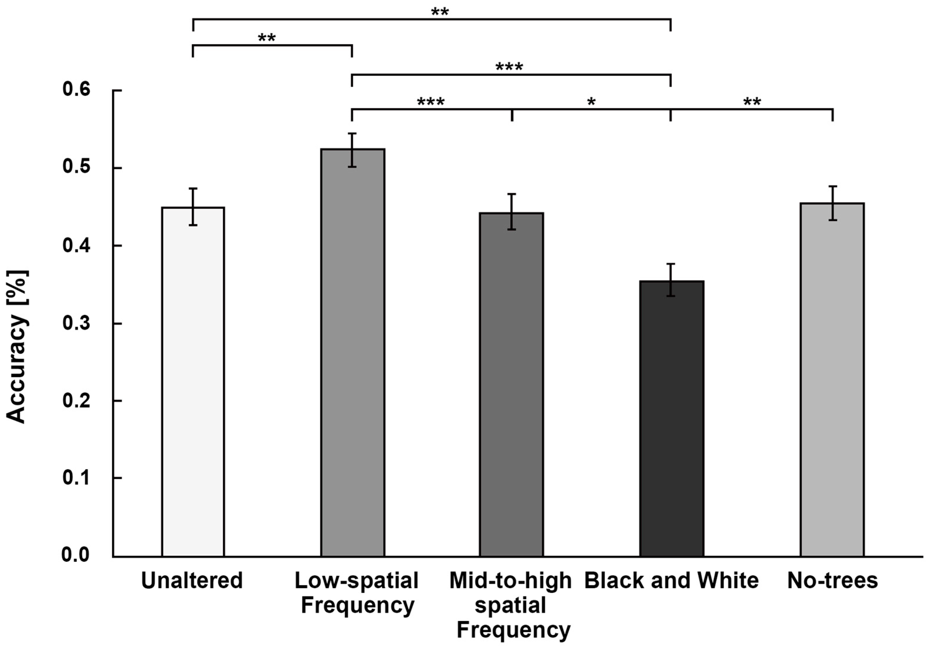 To analyze the impact of different visual conditions on participants’ street recognition performance, ANOVA (Analysis of Variance) was used to examine the effects of manipulated visual conditions (original, low-frequency, mid-to-high-frequency, black-and-white images, and no-trees images) on recognition accuracy. Recognition accuracy was defined as the percentage of correct identifications of the location depicted in each image across all participants.