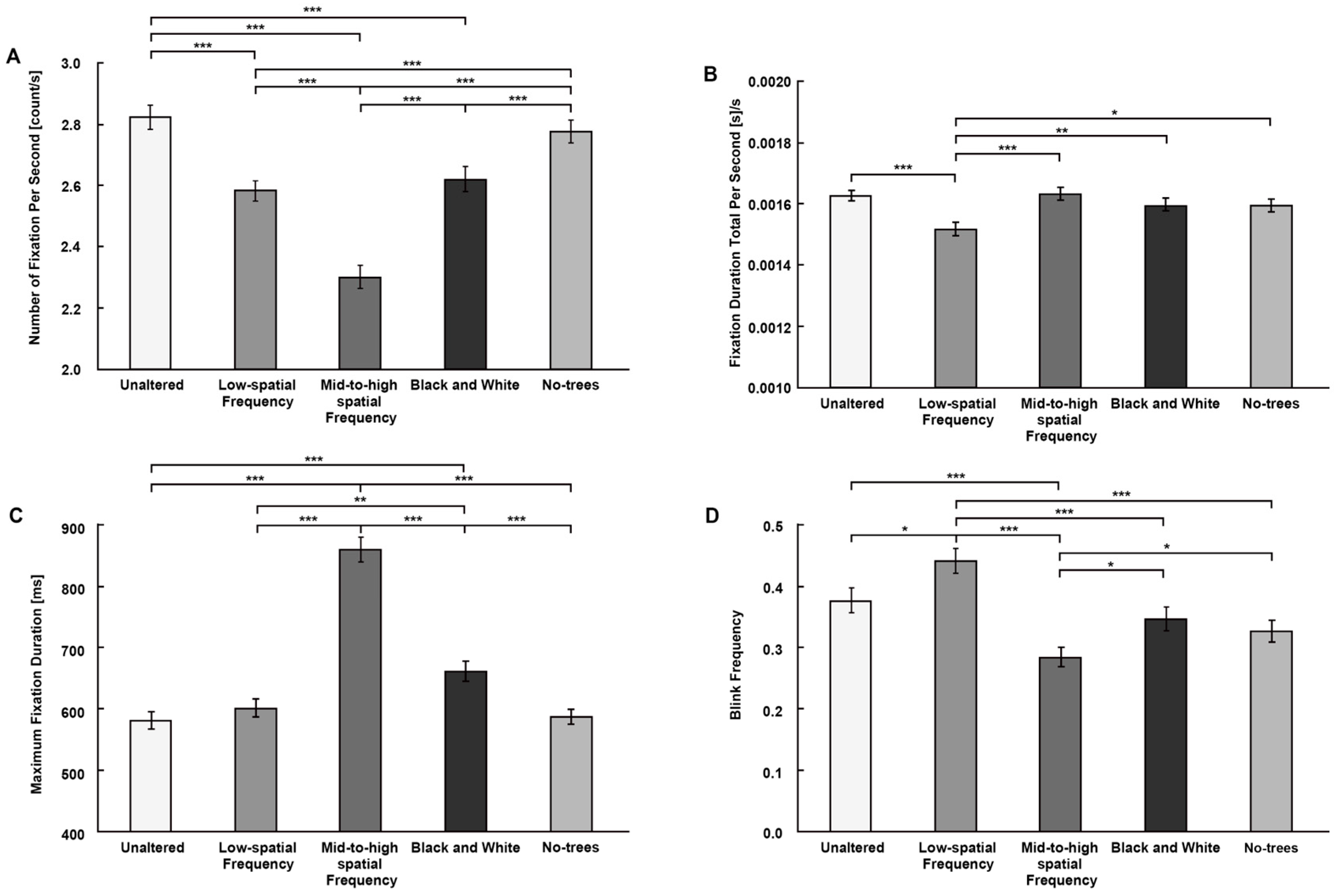 ANOVA results indicated a significant effect of image manipulation on maximum fixation duration (F(4, 1795) = 52.209, p < 0.001; η2 = 0.106). mid-to-high spatial frequency images and black-and-white images significantly increased maximum fixation duration compared to the original images (mid-to-high spatial frequency: mean difference = −279.627, 95% CI [−324.608, −234.646]; p < 0.001; black-and-white: mean difference = −80.908, 95% CI [−125.890, −35.927]; p < 0.001). In contrast, low-spatial-frequency images and the no-trees condition did not significantly affect maximum fixation duration (p > 0.05).