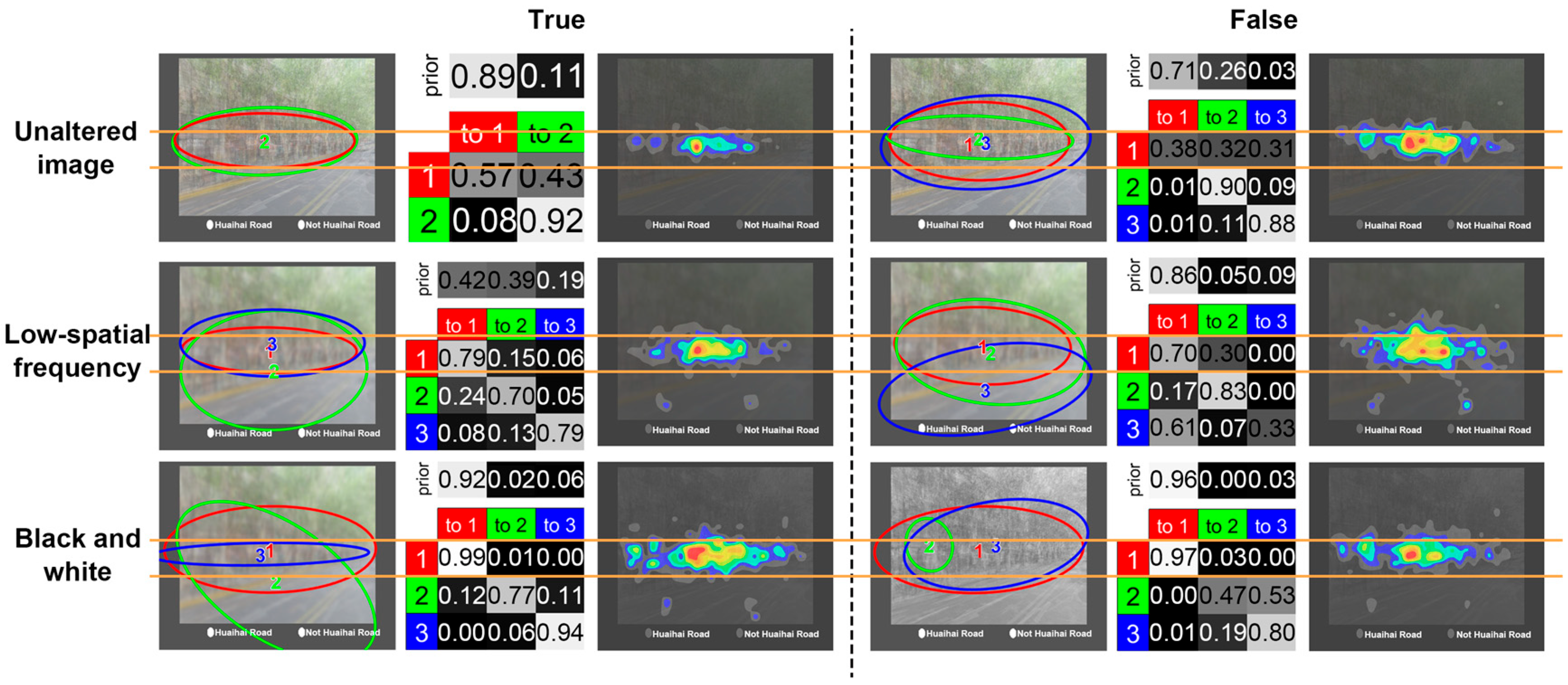 For the original, unmodified images, participants’ fixations were primarily concentrated in the first-floor storefront area, especially among those who correctly recognized the scene. The ROI marked in red, representing the most likely initial fixation region, captured 89% of first fixations in correct identifications. In contrast, incorrect recognitions were associated with more dispersed patterns; the probability of first fixations landing in the red ROI dropped to 71%, and gaze was more likely to shift toward second-floor facades and signage.