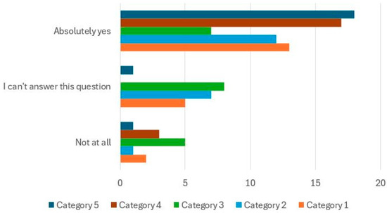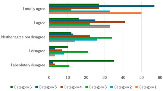 | Category 4: Assessment of the Appreciation/Acceptance by Users | 12–17 Years Old | 18–30 Years Old | 31–60 Years Old | >60 Years Old |