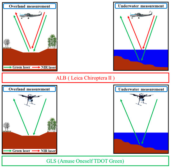 In overland and underwater surveys, Light Detection and Ranging (LiDAR) using near-infrared (NIR) and green laser (GL) from ALB (left side, NIR and GL) and GLS (right-side, GL) is shown, respectively (laser points are shown in grayscale).