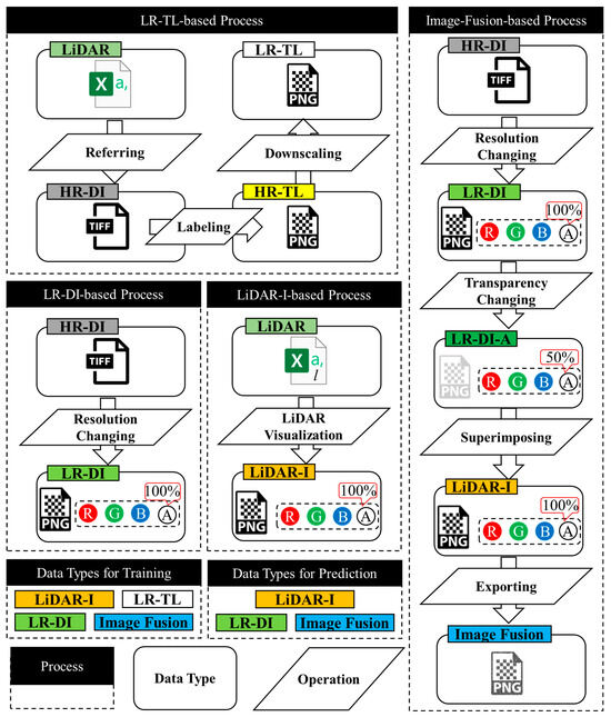Figure 3 depicts the processes for the production of imagery input data for this study. The processing includes four and three types of data for training (LR-TL, LR-DI, LiDAR-I, and image fusion) and for prediction (LR-DI, LiDAR-I, and image fusion), separately: low-resolution true label mapping based on the LiDAR reference derived from high-resolution digital images (LR-TL), low-resolution digital images derived from high-resolution digital images (LR-DI), images derived from LiDAR-based point cloud using a high-contrast color bar (LiDAR-I), and images created by superimposing the above images (image fusion).