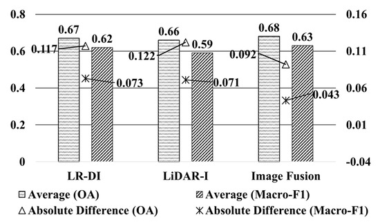 Among the data styles (LR-DI, LiDAR-I and image fusion) in this research, as shown in Figure 4, image fusion has shown its advantage compared with the other two types using OA and macro-F1. After comparing all seven types of land cover, as shown in Table S1, bamboo and tree are the only two types of land cover where the image fusion-derived results (F1 score) are always higher than the LR-DI- and LiDAR-I-derived results.