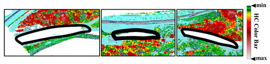 Briefly, after comparing the visual effects of various default color scales, the “high-contrast color scale” was chosen for this study. Furthermore, the selected color scale displayed the LiDAR data as imagery after dividing the GLS data (from min to max) into 256 steps. Moreover, the “high-contrast color scale” included six particular slides with different colors in the 0–50% segment of the color scale (i.e., 1%, 2%, 4%, 8%, 16%, and 32%). Derived from the high-density divided points in the 0–50% segment for LiDAR-based visualization, the difference between the familiar land cover (bare ground/grass or tree/grass) can be observed much more clearly than when using the default color bar (Blue > Green > Yellow > Red) in CC.