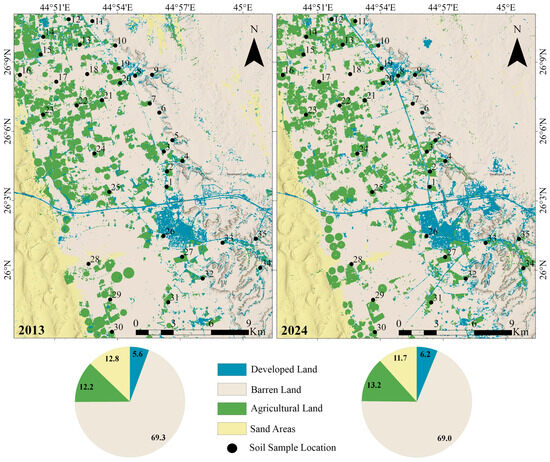 The geological map of the area presented in Figure S1 indicated that the sedimentary strata include a mix of Mesozoic and Cenozoic formations, reflecting varying depositional environments over time. The Mesozoic and Cenozoic sequence consists of Jurassic Dhruma, Tuwaiq Mountain limestone, Hanifa formations, and Quaternary deposits [31,32]. The Jurassic strata are characterized by extensive carbonate platforms, representing pure marine carbonate deposition. The later Mesozoic and Cenozoic periods brought further sedimentation, primarily of continental origin, with occasional marine influences in localized basins [33,34,35,36]. The agricultural soils of Al Ghat province exhibit specific intrinsic properties due to the arid climate and soil management practices in the region. Sandy soils are dominant in Al Ghat samples. Their texture often ranges from sandy to sandy loam, with a small proportion of clay content. The organic matter in soil samples is generally low (typically less than 1%). The pH levels of soils are slightly alkaline, often ranging between 7.5 and 8.5, with an average of 7.9. Al Ghat soil can be categorized into calciorthids (27 samples), torriorthents, and calciorthids (8 samples), as illustrated in Figure S2. Calciorthids are a type of aridisol that accumulates secondary carbonates, forming a calcic horizon and exhibiting textures that span from sandy to loamy [37]. Torriorthents, another type of Entisols, form mostly in residuum or colluvium on actively eroding slopes and in weathering-resistant materials. These soils are generally shallow, with a composition of loamy sand, fine sandy loam, sandy loam, loam, or clay loam, along with their gravely counterparts [37,38]. Figure 2 illustrates the land use within the study area, highlighting four categories—agricultural lands, developed lands, barren lands, and sand dunes—compared over an 11-year period from 2013 to 2024. Agricultural lands and developed lands, which constituted approximately 12.2% and 5.6% of the total area in 2013, respectively, showed a slight increase to 13.2% and 6.2% by 2024. This growth in the proportion of these categories was evidently at the expense of a reduction in barren lands and areas occupied by sand dunes.