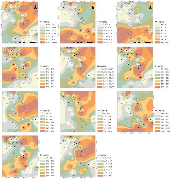 The concentration of HMs in the study area is shown in Table S1. The average HM values (mg/kg) were in the order of 11,480 (Fe), 7786 (Al), 277.86 (Mn), 72.37 (Zn), 28.66 (Ni), 21.80 (V), 19.89 (Cr), 19.00 (Co), 12.46 (Cu), 5.46 (Pb), and 2.69 (As). Figure 3 presents the spatial distribution of HMs per sample location. The higher concentrations of Al, Fe, V, Ni, Mn, and Co were recorded in samples 1–5, 8, 9, 11, and 12 in the eastern and somewhat northern parts of the study area in slopes of the Jurassic sequences, whereas the lower values were reported towards the western part. This indicated the geogenic source of these HMs in the investigated farms. Most higher levels of Cu and Pb were reported in samples 28, 31, and 33 in the southern part of the study area, whereas the higher values of Zn were reported in the southern and eastern parts. Regarding the spatial distribution of As and Cr, it is noted that the higher values are scattered in the eastern, northern, and western parts of the study area.