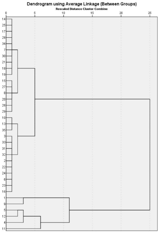 In this study, the Q-mode hierarchical cluster analysis (HCA) is used to classify sampling sites based on their similarities in HM concentrations. The dendrogram uses average linkage clustering to group the 35 sites into three clusters, indicating areas that share similar contamination levels or sources (Figure 4). The first cluster has 6 sites (1, 4, 5, 9, 11, and 12), the second has 13 sites (2, 3, 6, 10, 13, 16, 22–24, 31–33, and 35), whereas the third cluster accounts 16 sites (7, 8, 14, 15, 17–21, 25–30, and 34). Samples of cluster 1 were collected from farms located close or in the Jurassic mountain toes and obtained greater values of As, Co, Cr, Cu, Fe, Mn, Ni, Pb, and V (4.00, 27.00, 31.00, 17.33, 20,433, 693.67, 42.00, 6.00, and 36.17 mg/kg, respectively). These farms may share a specific contamination source or uniform natural conditions, mainly related to parent rock mineralogy and natural weathering processes. Samples of cluster 2 display lower values of Al, As, Co, Cr, Cu, Fe, Mn, Ni, Pb, V, and Zn (5154, 2.02, 29.62, 13.00, 10.54, 7092, 167.23, 28.77, 4.08, 13.62, and 93.77 mg/kg, respectively). The exception of these samples is sample 3, which obtained the highest concentrations of Co, Ni, and Zn (168.0, 109.0, and 289.0); proximity might be related to agricultural activities, such as the use of fertilizers and pesticides. Samples of cluster 3 indicate high similarity in HM concentrations and include intermediate HM values between those of clusters 1 and 2, except sample 28, which obtained the highest concentration of Pb (25.00 mg/kg), suggesting partial anthropogenic contamination.