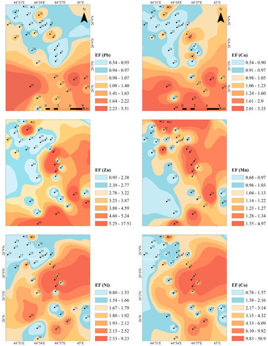 Spatial distribution of EF per sample locations for Pb, Zn, Ni, Cu, Mn, and Co in Al Ghat agricultural soils.