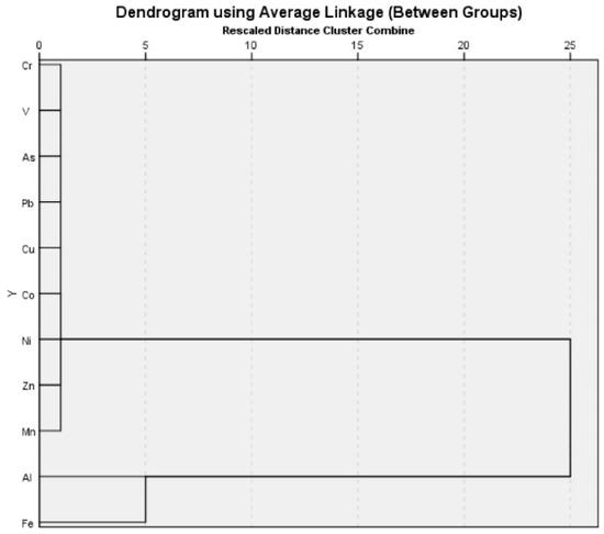 The R-mode HCA is a statistical technique used to group HMs based on their similarity in behavior or distribution [46]. It groups the HMs based on their similarity into two clusters (Figure 6). The shorter the linkage distance, the more similar the HMs are [47]. The first cluster accounts for Fe and Al, which cluster closely, indicating they have a strong geogenic origin, likely from the same parent rock material or weathering processes. The second cluster includes Mn, Zn, Ni, Co, Pb, Cu, As, V, and Cr, suggesting some shared geochemical behavior from natural co-occurrence in soil mineralogy or anthropogenic influence, such as the use of fertilizers or pesticides, especially for Pb, Cu, and Zn [11].