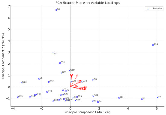 The scatter plot presented in Figure 7 visualizes the relationship between the samples and the principal components while also using the PCA loadings to interpret the contributions of each variable to these components. Most samples form a dense cluster near the center, indicating similar characteristics, while samples such as 3, 11, and 13 are outliers, separated from the main cluster, indicating unique compositions of HMs, which may be due to localized agricultural practices. Al, Cr, Fe, and V are strongly correlated with PC1, which appears to represent that these HMs are commonly found in geological formations, while Co, Ni, and Zn are strongly correlated with PC2 and may represent anthropogenic influences. Cu and Pb have moderate contributions to both PCs, with Pb being distinct in the upper PC2 axis.