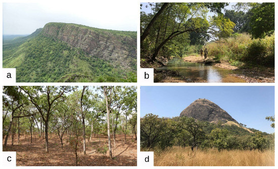 Habitats in Fazao-Malfakassa National Park: (a) cliffside vegetation near Boulohou–Souroukou; (b) riparian vegetation along the Kamaka River near Binako; (c) woodland–savanna near Kalaré; (d) woodland–savanna near Mont Kpéya.