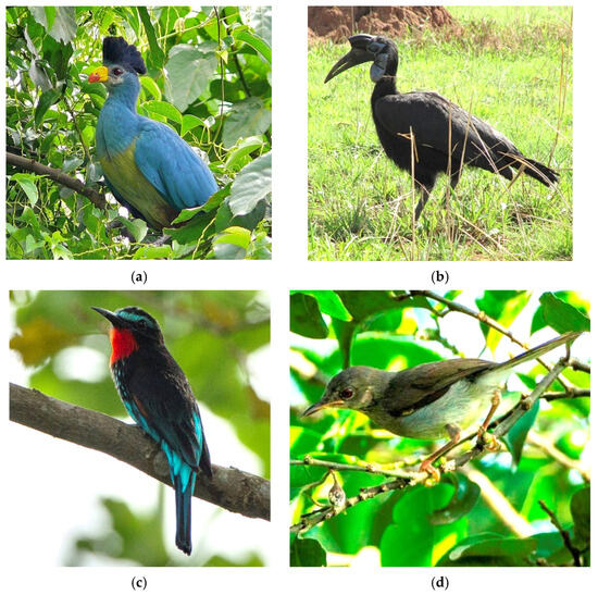 Salient bird discoveries in Fazao-Malfakassa National Park, Togo, during 2022–2024 include the first observations of (a) Great Blue Turaco (Corythaeola cristata) since 1990; the first observations of (b) Abyssinian Ground-Hornbill (Bucorvus abyssinicus) since 2019; the first observation of (c) Black Bee-eater (Merops gularis) since 1990; and the first record of (d) Sharpe’s Apalis (Apalis sharpie), a species Near-Threatened with extinction [32], in the park.