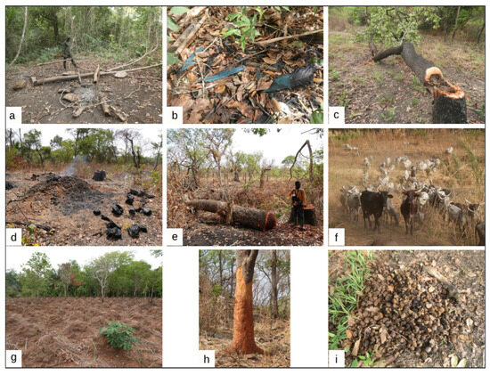 Illegal activities recorded in Fazao-Malfakassa National Park: (a) Poacher camp discovered in the forest in March 2023. This camp, obviously regularly used and maintained, had a hearth, a table, branches for smoking meat, Great Blue Turaco feathers, and Detarium fruit, highlighting the multitude of illegal activities carried out by offenders entering the park; (b) Feathers of a poached Great Blue Turaco found in the poachers’ camp from (a) in March 2023. The presence of this large forest species, which is extremely rare in West Africa, had just been rediscovered in the park and in Togo the day before; (c) a tree cut down to harvest wild honey, March 2023, with visible openings made in the trunk to drain the honey. All trees in which a beehive has been spotted are felled to harvest a few liters of honey regardless of the trees’ size or age; (d) charcoal production kiln in the Kalaré area; (e) large tree recently felled for charcoal production in the Kalaré area, March 2022; (f) herd of cattle led by the Fulani herders, March 2023. Herds represent one of the most widespread threats to the park, as they destroy vegetation by grazing or trampling it; they enter into direct competition for food with wild mammals, to which they also risk transmitting diseases, and accelerate the erosion of river banks; (g) yam field inside the park in May 2022; (h) tree of Khaya senegalensis whose bark had been removed from the entire circumference several meters above the ground, March 2023; (i) Detarium fruit pile found in March 2023. Although this activity likely has less impact than others, it raises the opportunity of other illegal activities aimed to maximize the financial income that can be obtained from entering the park.