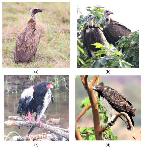 Salient raptor declines in Fazao-Malfakassa National Park were indicated by apparent extirpations of the globally Critically Endangered (a) White-backed Vulture (Gyps africanus) and (b) Hooded Vulture (Necrosyrtes monachus), as well as the increased rarity of the globally Endangered (c) Bateleur (Terathopius ecaudatus) and (d) Martial Eagle (Polemaetus bellicosus).