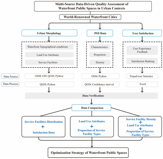 Herein, we propose a new evaluation approach based on the integration of multi-source data in urban contexts to enhance the analysis and assessment of urban environments. Since waterfront spaces, urban morphology, urban activities, and user satisfaction are essential for analyzing the spatial dynamics that shape the functionality, livability, and overall quality of waterfront environments, they are adopted as key components in this research. Firstly, waterfront areas are unique urban public spaces where the natural and built environments intersect. Analyzing their spatial relationships can help identify key patterns to improve cities’ functionality and experiential quality. Secondly, urban morphology, as the structural framework of a city, significantly influences how users perceive and utilize public spaces. By incorporating urban morphology into our analysis alongside urban activities and user feedback, we gain a deeper understanding of how spatial configurations and surrounding activities jointly impact user satisfaction. Finally, user satisfaction serves as a direct indicator of the success of public spaces. By combining user evaluations, POI data, and urban morphology, this study addresses the limitations of previous research, which often relied on single-dimensional analyses, such as accessibility or planning logic. Therefore, in this work, we incorporate three dimensions—user satisfaction (people), points of interest (places), and urban morphology (spaces)—to comprehensively assess waterfront public spaces. Specifically, by analyzing these diverse data types at an urban scale, we aim to uncover the relationships among service facility distribution, land-use functions, and spatial morphology in influencing user satisfaction. The proposed approach allows us to holistically assess waterfront public spaces and analyze their spatial characteristics and common influencing factors under varying urban contexts, offering new insights into the sustainable development of waterfronts worldwide.
