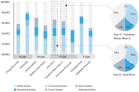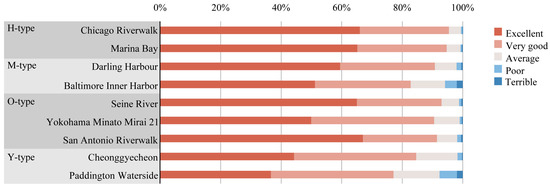 The high service quality of waterfront public spaces can primarily be attributed to their strategic geographical locations. According to the “Global Estuary Cities Development Report” (2022), two cases of the H-type (Chicago Riverwalk and Marina Bay) were key developmental zones at the confluence of rivers and seas within urban coastal belts, making them prominent urban features with developmental resources often concentrated in these regions. Meanwhile, two cases of the O type (Seine River and San Antonio Riverwalk) have the “river islands” of the waterbody located at the city’s center. All four cases are significant features of the waterfront city, with a development orientation that shapes the city’s image, and urban development resources are predominantly directed towards this area. Driven by the global trend of developing waterfront areas for tourism, these regions tend to have more comprehensive entertainment options, commercial facilities, and support services [61]. Conversely, the Y-type had small waterbody volumes and long and narrow waterfront spaces, which was not conducive to the arrangement of various service facilities. Therefore, most service facilities in Y-type were scattered and could not form a closely connected service network, thus affecting the service quality of the waterfront spaces [62].
