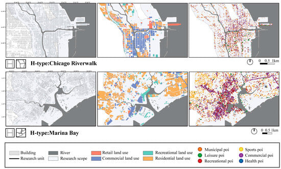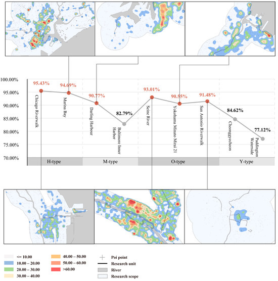 Among the nine research units, the four cases of Chicago Riverwalk, Marina Bay, Seine River, and San Antonio Riverwalk exhibited high satisfaction levels (>91%). These four cases can be further divided into two types of waterbody morphologies. One is the H-type, which Chicago Riverwalk and Marina Bay represent. Its characteristic is that the bifurcated waterbodies flow simultaneously towards the estuary, forming two urban shorelines. The inland shorelines converge over short distances, forming a compact, inward-oriented spatial pattern. Commercial activities dominate the intersections and transition into residential areas further inland along the river in this configuration. Service facilities are densely clustered at the intersections and gradually dispersed outward. Commercial and retail facilities are numerous and dense at the intersections. In contrast, health, municipal, and recreational facilities are fewer and more scattered, with sports facilities located further from the water body. The other is O-type, represented by Seine River and San Antonio Riverwalk. Its characteristic is that waterbodies and urban spaces are separated, forming “river islands” surrounded by branching segments. The service facilities exhibit a centralized distribution pattern, with major facilities primarily consisting of municipal, commercial, and retail services. A few recreational facilities, health infrastructure, and sports facilities are scattered in the surrounding area. It can be concluded that both the H-type and O-type exhibit good topographical potential for spatial development services. These morphological features facilitate the formation of a polycentric network of service facilities. Such a network is beneficial for enhancing the service capacity of waterfront public spaces and broadening their coverage areas. Additionally, the water junctions in the H-type and “the river islands” in the O-type are conducive to developing high-quality core experience zones. Meanwhile, they are beneficial for the design of advanced waterfront spaces for living and leisure while improving the user’s experience in the waterfront areas. In contrast, some research units have lower service qualities because their service facilities are dispersed and do not form a clustered network (see Figure 9).