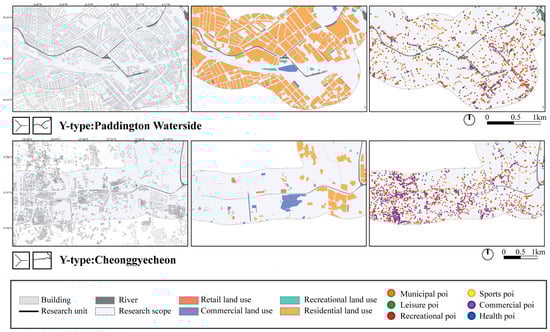 - Y-type: The land use distribution tended to form local clusters, largely influenced by the linear distribution of water bodies. While the overall distribution of service facilities was balanced, their densities were higher near these water bodies, although the overall distribution remained sparser compared to other types.