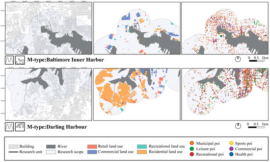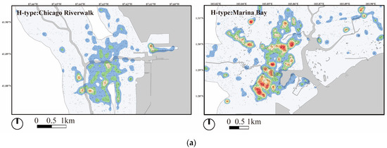 - M-type: Two research units showed different main density areas. Baltimore Inner Harbor mainly had medium- to low-density areas, while Darling Harbour mainly had high-density regions. Both units were sparsely distributed along the coastline, tending to concentrate on a single segment of the coastline, presenting a single center with a multiple-point pattern.