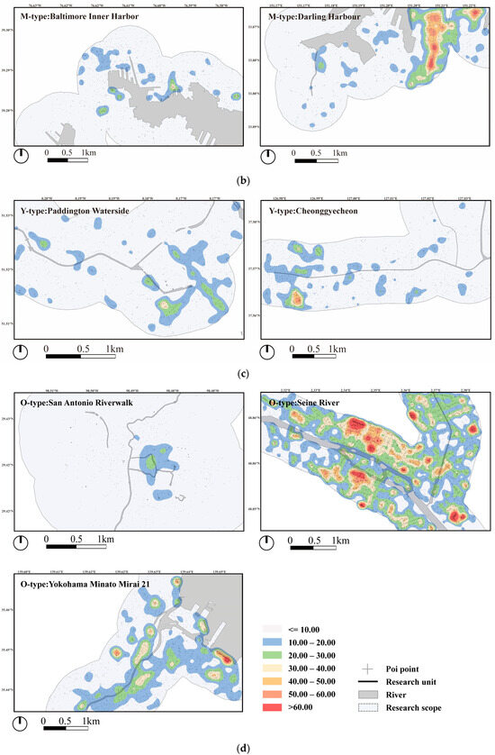 - O-type: Three research units had different densities. Seine River had the highest kernel density, while San Antonio Riverwalk had the lowest. However, these units had a compact distribution. High-density areas were not concentrated in the central circular part, generally showing a multi-centered cluster trend.
