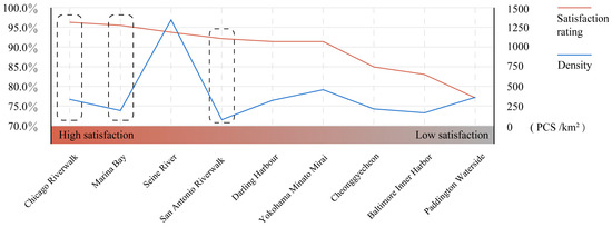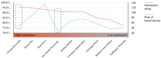 Figure 11 shows the relationship between user satisfaction and peak kernel density. One can see a certain correlation between user satisfaction and kernel density peak in most research units. However, two units (Chicago Riverwalk and San Antonio Riverwalk) still showed a weak correlation between user satisfaction and kernel density peak (see the dotted boxes in Figure 11). Figure 12 shows the relationship between user satisfaction and service facility density. It could also be observed from Figure 12 that there were three units (Chicago Riverwalk, Maria Bay, and San Antonio Riverwalk) that showed a clear weak correlation between user satisfaction and density (see the dotted boxes in Figure 12). Considering that user satisfaction is often affected by regional culture, religion, climate, and other factors, neither the kernel density nor density data can be used as a rigid index to evaluate service quality.