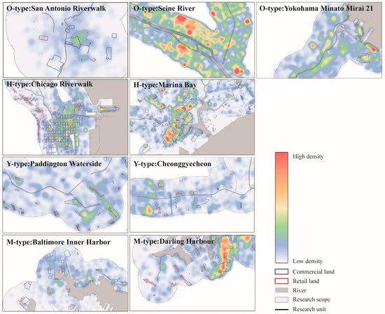 By extracting the kernel density data and the land use information of the nine research units, the correlation between land use attributes and the kernel density of service facilities could be analyzed. As shown in Figure 13, most areas with the densest distribution of service facilities in the research units were adjacent or overlapping with commercial land. Therefore, it could be considered that the distribution density of service facilities was affected by land use attributes. Due to the limitations of OSM data classification, the data on land use attributes in the O-Seine River research unit were incomplete, and the related analysis results were limited.
