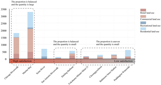 Figure 14 presents the proportions of service facilities with different land-use attributes in the nine research units (see Table S9 for detailed information). In most research units, service facilities were predominantly concentrated in retail and commercial land use, while recreational land use had the lowest proportion. Among these research units, Chicago Riverwalk and Marina Bay, with many service facilities especially for commercial land use, exhibited high user satisfaction, as shown in the dotted box in the leftmost of Figure 14. Although San Antonio Riverwalk and Darling Harbour had a small number of service facilities, the distributions of their service facilities for different land-use attributes were balanced, leading to moderate user satisfaction (see the dotted box in the middle of Figure 14). In contrast, some research units with lower user satisfaction generally had fewer service facilities and sole land-use attributes (see the dotted box in the rightmost of Figure 14). Such sole land-use attributes constrained the development of waterfront public spaces, weakened their resilience, and ultimately reduced the service quality of the spaces. For instance, in the cases of Yokohama Minato Mirai 21 and Baltimore Inner Harbor, service facilities for retail and commercial land use accounted for over 79% of the total, while Cheonggyecheon exceeded 52%. The number of facilities for other land-use attributes in the three research units was significantly low. The excessive concentration of commercial facilities in waterfront spaces made them heavily dependent on commercial activities, possibly leading to low user satisfaction. Moreover, in the case of Paddington Waterside, the proportion of service facilities for residential land use accounted for over 72% of the total. Since these facilities primarily served as basic infrastructures for residents and had limited entertainment value, the lack of diversity in facility types led to monotonous spatial experiences. Therefore, it can be concluded that service facilities with diverse land-use attributes are advantageous for enhancing service quality and user satisfaction of waterfront public spaces.