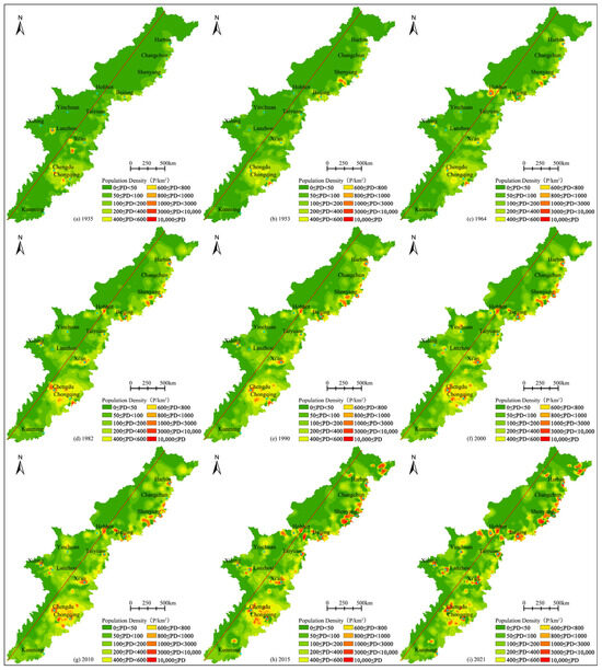 Using inverse distance weighted (IDW) spatial interpolation, the population density values for each county and city within the “Mid-Spine Belt of Beautiful China” were visualized, resulting in a series of population density classification maps (Figure 2) spanning from 1935 to 2020. These maps reveal a strikingly uneven population distribution within the region. Specifically, the population density on the southeast side of the Hu Huanyong Line is significantly higher than on the northwest side, with dense populations primarily clustered around provincial capital-centered urban agglomerations, forming distinct population concentration zones in certain areas. Population density is categorized into three classes: high-density areas (≥400 people/km2), medium-density areas (200–400 people/km2), and low-density areas (<200 people/km2).