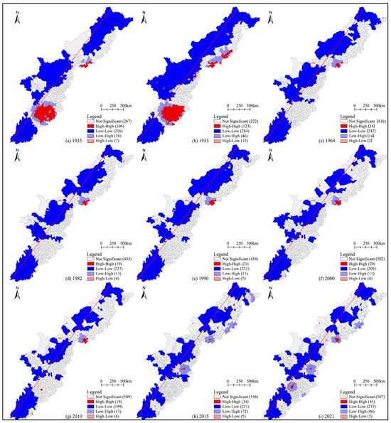 At a 5% significance level, the population density distribution of the “Mid-Spine Belt” has always exhibited characteristics of spatial agglomeration (Table 1). From 1935 to 1953, the Global Moran’s I index rose from 0.153 to 0.256, indicating a temporary increase in population agglomeration. In 1964, it decreased to 0.116, indicating a trend towards population dispersion. From 1964 to 2000, it continued to rise from 0.116 to 0.162, with areas where the population density of counties and cities was similar, aggregating spatially, and the differences in spatial development became increasingly significant. From 2000 to 2020, it continued to decline from 0.162 to 0.111, weakening the trend of spatial convergence in population density and reducing the differences in spatial development. In summary, the population density distribution in the “Mid-Spine Belt of Beautiful China” exhibits positive spatial correlation, and the population density distribution of counties and cities is not independent in space, meaning that areas with low population density are adjacent to each other, and areas with high population density are also adjacent to each other.