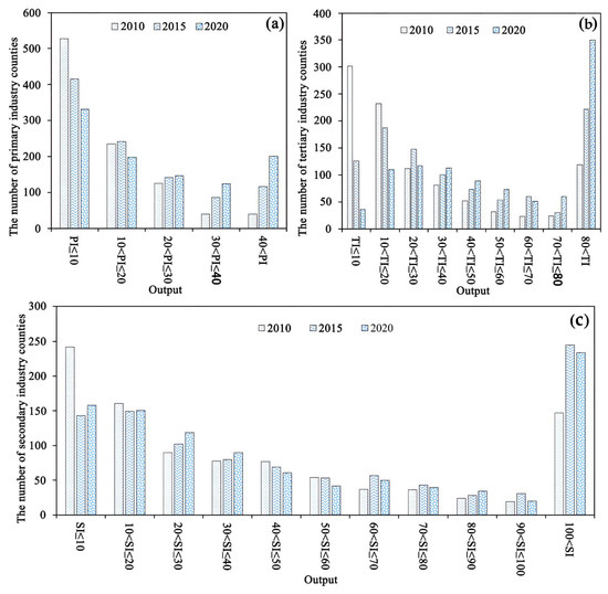 Changes in the number of counties in the “Mid-Spine Belt of Beautiful China” by socioeconomic level from 2010 to 2020: (a) the number of primary-industry counties; (b) the number of tertiary-industry counties; (c) the number of secondary-industry counties.