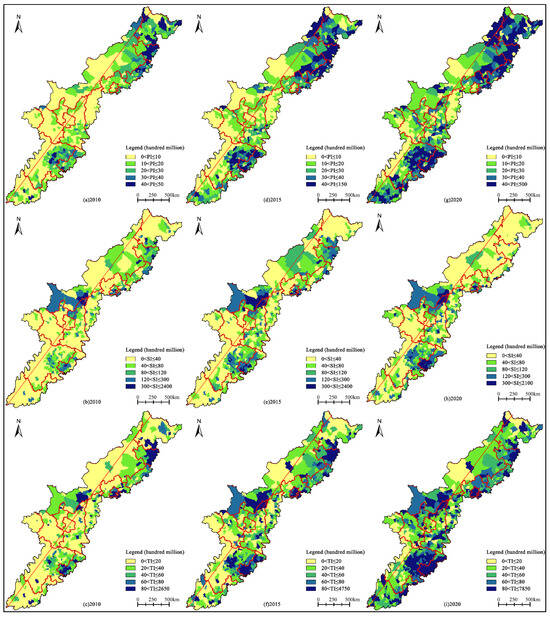 Spatial–temporal evolution characteristics of socio-economic indicators in the “Mid-Spine Belt of Beautiful China” at the local scale from 2010 to 2020: (a,d,g) are the spatial–temporal evolution characteristics of the primary industry at the local scale from 2010 to 2020; (b,e,h) are the spatial–temporal evolution characteristics of the secondary industry at the local scale from 2010 to 2020; (c,f,i) are the output values of the tertiary industry at the local scale from 2010 to 2020.