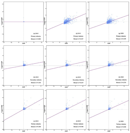 From 2010 to 2020, the spatial agglomeration degree of socioeconomic indicators in the “Mid-Spine Belt of Beautiful China” at the global scale was not high; it was relatively dispersed and there were significant spatiotemporal differences (Figure 6). In terms of the size of the global agglomeration index, the trend was as follows: I secondary industry < I primary industry < I tertiary industry; in terms of the magnitude of changes in the global agglomeration index, the “Mid-Spine Belt of Beautiful China” showed the largest change in I primary industry, followed by I tertiary industry and I secondary industry. From 2010 to 2020, the slope of the trend line of primary industry agglomeration degree showed an increasing–decreasing trend; the trend line of secondary industry agglomeration degree showed a parallel state; and the slope of the trend line of tertiary industry agglomeration degree showed a continuously weak downward trend. The overall change in secondary and tertiary industries was not obvious.