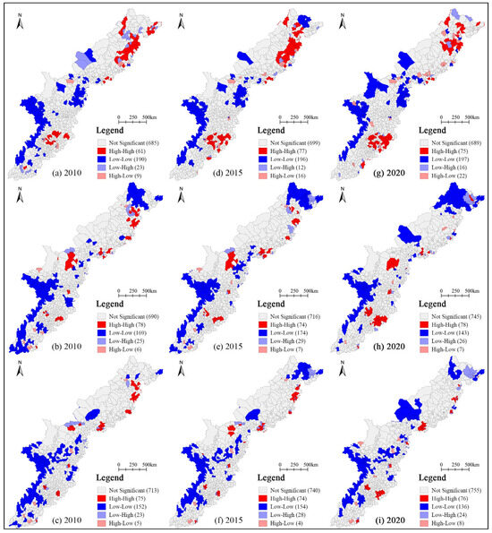 From 2010 to 2020, the spatial aggregation characteristics of socioeconomic indicators on a local scale in the “Mid-Spine Belt of Beautiful China” exhibited significant heterogeneity (Figure 7). The overall development of the primary industry was relatively dispersed, with high agglomeration levels in the Northeast China urban agglomeration and the Sichuan Basin urban agglomeration, while low-agglomeration areas were mainly concentrated in the marginal areas of the Qinghai–Tibet Plateau (i.e., the northern part of the southwest section of the “Mid-Spine Belt of Beautiful China”) and Shanxi Province. The areas with high agglomeration levels of secondary and tertiary industries were relatively few and scattered, while the low-agglomeration areas were mainly located in the marginal areas of the Qinghai–Tibet Plateau and the border areas between Northeast China and Russia.