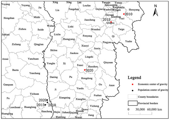where n represents the number of county-level administrative units; X and Y represent the spatial locations of the population and economic centers of the entire study area; Xi and Yi represent the spatial locations of the center of the ith county-level unit; and Pi represents the population or GDP of the ith county-level unit.