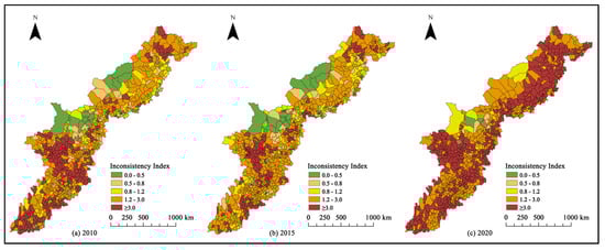 The consistency between the economic level and population in the “Mid-Spine Belt of Beautiful China” shows significant regional differences (Figure 9). In 2010, the overall inconsistency index was higher on the right side of the Hu Huanyong Line, and the inconsistency index was also higher on both sides of the lower and middle sections of the Hu Huanyong Line, that is, on the eastern side of the Middle Ridge Zone. For example, the Chengdu–Chongqing urban agglomeration had a higher inconsistency index due to its large population, while the northeastern and central–western parts of Yunnan had higher inconsistency indices due to their lower economic levels. The inconsistency index in the Middle Ridge Zone was lower, mainly in eastern Inner Mongolia, northern Shanxi Province, and Ningxia, where the economic level was low and the population was small, resulting in a lower inconsistency index. In 2015, the inconsistency index in the northeastern and southwestern parts of the “Middle Ridge Zone” decreased slightly, but not significantly. For example, the southernmost part of the Middle Ridge Zone saw a decrease in the ratio of population to economic development due to economic growth, resulting in a lower inconsistency index. In 2020, the overall inconsistency index between population and economy in the “Middle Ridge Zone” increased, especially in the northeastern and southwestern parts of the Middle Ridge Zone. The inconsistency index also increased due to the rapid development of economy and urbanization in Liaoning, Jilin, the Beijing–Tianjin–Hebei urban agglomeration, and the Chengdu–Chongqing urban agglomeration, and a large influx of population, leading to an increase in the ratio of population to economy and thus a higher inconsistency index. At this time, only a small part of the central and western parts of Inner Mongolia, northern Shaanxi Province, and eastern Inner Mongolia had an inconsistency index close to 1, indicating that the degree of population growth was consistent with the level of economic agglomeration.