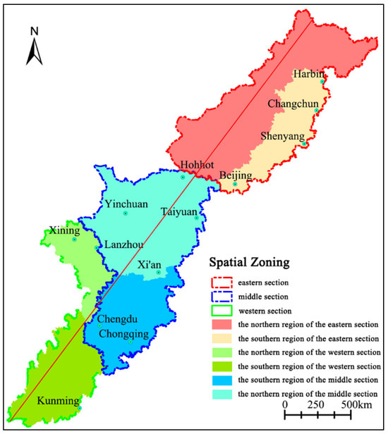 Based on the analysis of the overall population distribution, socio-economic factors, and their spatiotemporal correlations in the “Mid-Spine Belt of Beautiful China”, this article divides the “Mid-Spine Belt of Beautiful China” into three parts: east, central, and west, with six regions (Figure 10).