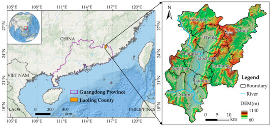 Jiaoling County is located in the southeastern part of China, in the northeastern region of Guangdong Province (Figure 1). It covers an area of approximately 960 square kilometers, with elevations ranging from 60 to 1140 m. The study area is surrounded by mountains and features a terrain that slopes from north to south, with 82,690 hectares of mountainous land and 5900 hectares of cropland, making it a typical mountainous and hilly region. The primary crops in the area include rice, vegetables, and peanuts, with the local specialty rice, “Silk Rice”, accounting for over 70% of the rice cultivation in the county. The land use types in the region are complex, and the cultivated land is highly fragmented and dispersed, making it difficult to quantitatively monitor cultivated land resources. Additionally, the region’s serious population outflow, destruction of agricultural facilities, and poor road accessibility restrict the sustainable cultivation of cultivated land. Studying cropland abandonment in this region can provide valuable insights for policy development and direction.