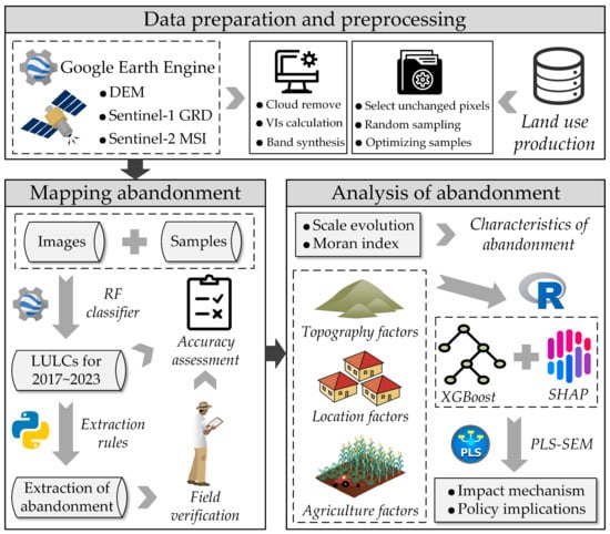 The research process is mainly divided into three major steps (Figure 2): (1) Preprocessing of remote sensing imagery and land use products to obtain annual classification-ready images and land cover sample points. (2) Using the Random Forest classifier to generate land cover classification maps for Jiaoling County from 2017 to 2023, followed by applying the land use change trajectory method to map the distribution of cropland abandonment, and conducting accuracy assessments for abandoned land extraction by visual interpretation and field investigation. (3) Utilizing zonal statistics and spatial autocorrelation analysis to explore the spatiotemporal distribution characteristics of cropland abandonment, coupling the XGBoost with SHAP methods and the PLS-SEM model to analyze the importance, response characteristics, and influence pathways of various factors affecting cropland abandonment, ultimately explaining the causes of abandonment and providing policy recommendations for local cropland management.