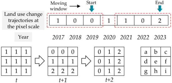 (1) This study proposed a cropland abandonment extraction method based on land use change trajectories, which identified abandoned cropland by tracking the changes in cropland pixels (Figure 3). Importantly, cropland abandonment is defined in this study as land that has not been cultivated for two consecutive years and is covered by natural vegetation. Based on this definition, the land use classification results were first reclassified: cropland pixels were reclassified as 1, grassland and forest pixels as 0, and water bodies, barren land, and built-up land as 2. To further eliminate the effects of fallow land and classification errors, pixels that are converted from cropland to grassland or forest and remain in this state for two years are considered abandoned. This study constructs a detection window with a time span of three years and a step length of one year. If a pixel is classified as cropland (1) in year , and classified as grassland or forest (0) in years and , the cropland is considered abandoned. The final year of conversion to grassland or forest () is marked as the year of abandonment. The window slides to the right starting from 2017 to obtain the abandoned land identification results from 2019 to 2023.
