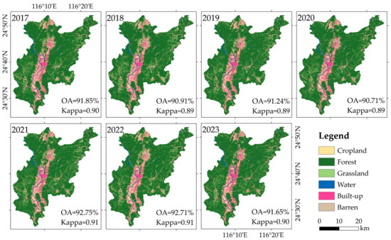 Results of land use classification from 2017 to 2023 in Jiaoling County.