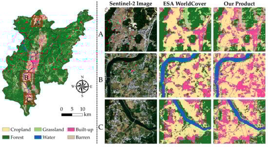 Results of the land use classification from 2017 to 2023 are shown in Figure 4. It can be observed that our land use products have an overall accuracy exceeding 90%, with a Kappa coefficient greater than 0.89. The UA and PA for cropland were both over 90% (Figure S3), indicating excellent accuracy. To further validate the accuracy of our land use products, we compared our results with the ESA WorldCover 10 m resolution product (Figure 5). The results showed that our product exhibited high spatial consistency with ESA’s. In summary, our land use products have high usability and can be used for subsequent cropland abandonment extraction. According to the land use results, the overall land cover in Jiaoling County is predominantly forest, accounting for over 75% of the total area. Cropland resources are mainly distributed in the narrow plains in the central region and along both sides of the Shiku River that runs through the city, showing spatial consistency with the distribution of built-up areas.