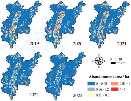 Spatial distribution of abandoned cropland from 2019 to 2023 at 500 m grid scale.