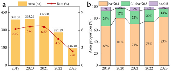 (a) Evolution characteristics in the area and rate of newly abandoned cropland; (b) Proportion of newly abandoned cropland by different plot sizes.