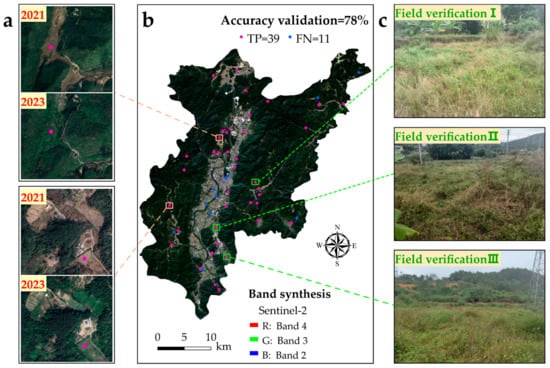 Accuracy evaluation of abandoned land extraction in 2023. (a) Visual interpretation results from Google high-resolution imagery; (b) Distribution of abandoned land validation points; (c) Field survey photos.